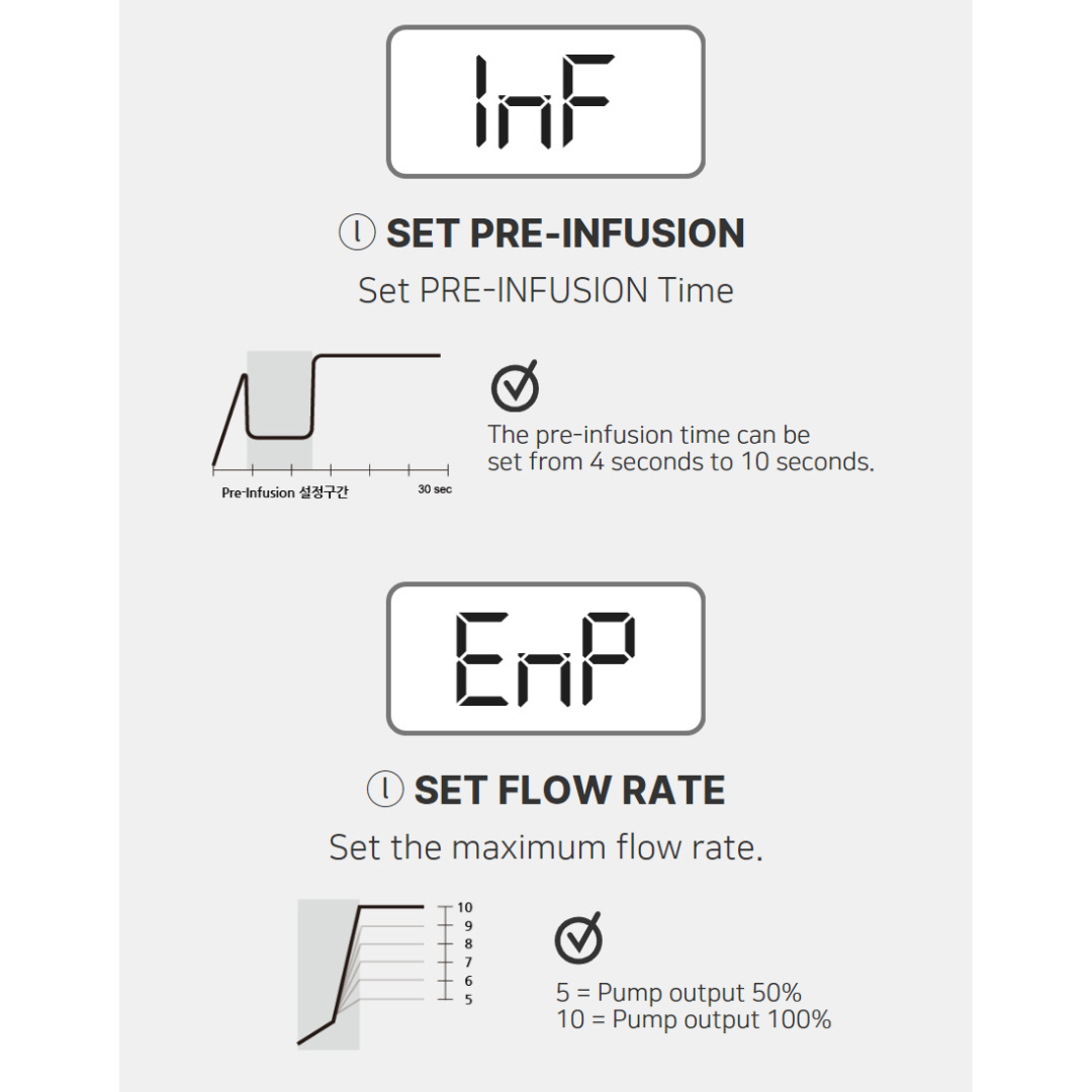 Featuring advanced functions such as ECO-Standby Mode, Adjustable Pre-Infusion Time, and Customizable Flow Rate Control — designed to give you complete precision and energy efficiency with every shot.