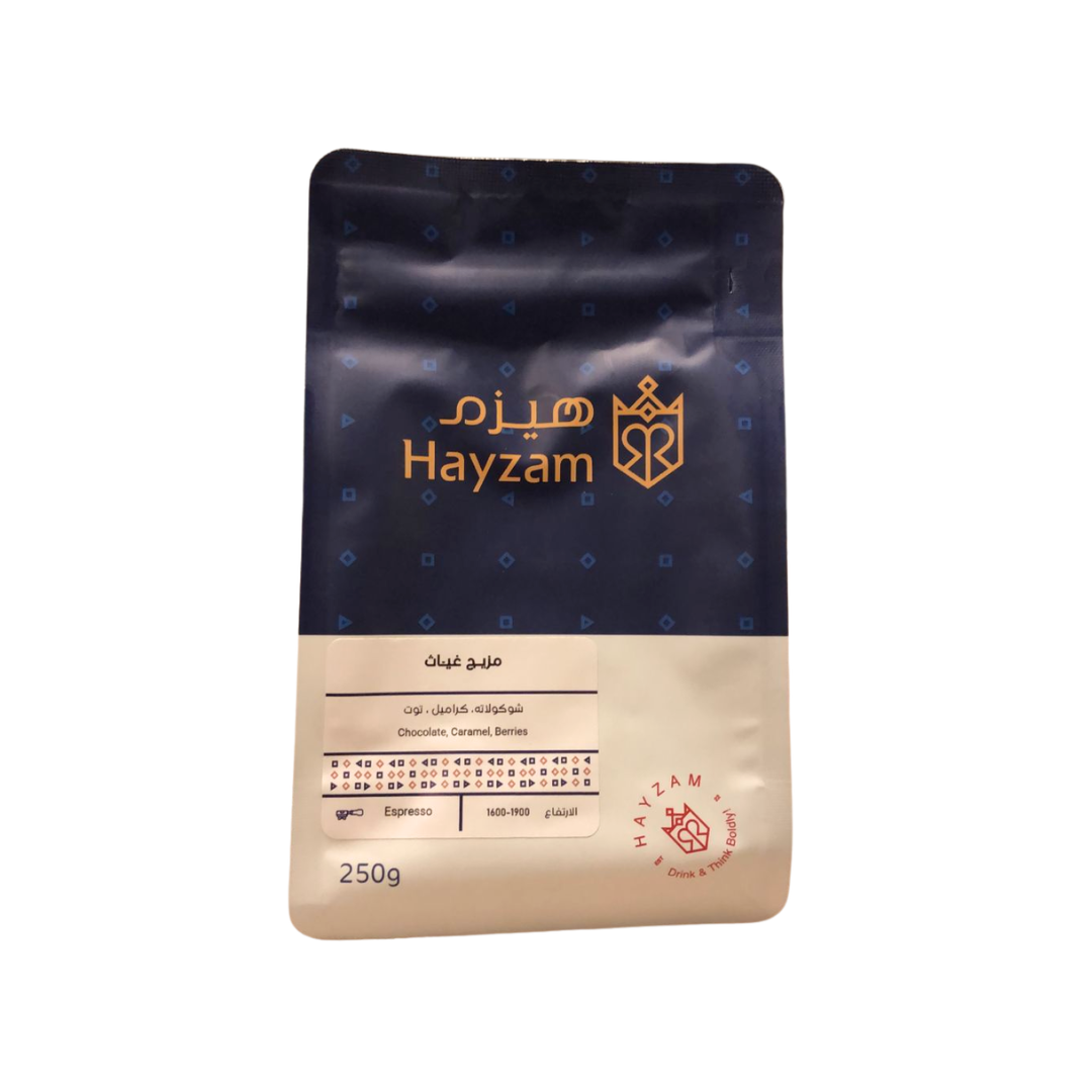 HAYZAM ROASTERY's Ghayath Mix delivers a sophisticated blend crafted for discerning coffee enthusiasts. This 250g selection combines carefully sourced beans roasted to highlight complex flavor profiles and aromatic depth. Each cup reveals balanced notes with a smooth finish, ideal for espresso, pour-over, or traditional brewing methods. The medium roast level preserves the beans' origin characteristics while developing rich body and subtle sweetness. Perfect for those seeking premium quality and consistent excellence in their daily ritual.