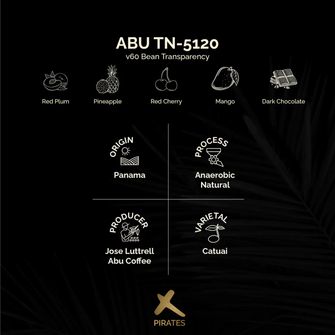 Discover the bold complexity of Pirates of Coffee's ABU TN 5120 Panama Anaerobic Natural beans. This 250g single-origin offering showcases the distinctive character of anaerobic fermentation, delivering rich, fruity notes with exceptional depth. Sourced from Panama's premier growing regions, these specialty-grade beans are roasted to highlight their unique processing method. Perfect for espresso enthusiasts and filter coffee lovers seeking an adventurous, full-bodied cup with pronounced flavor complexity.