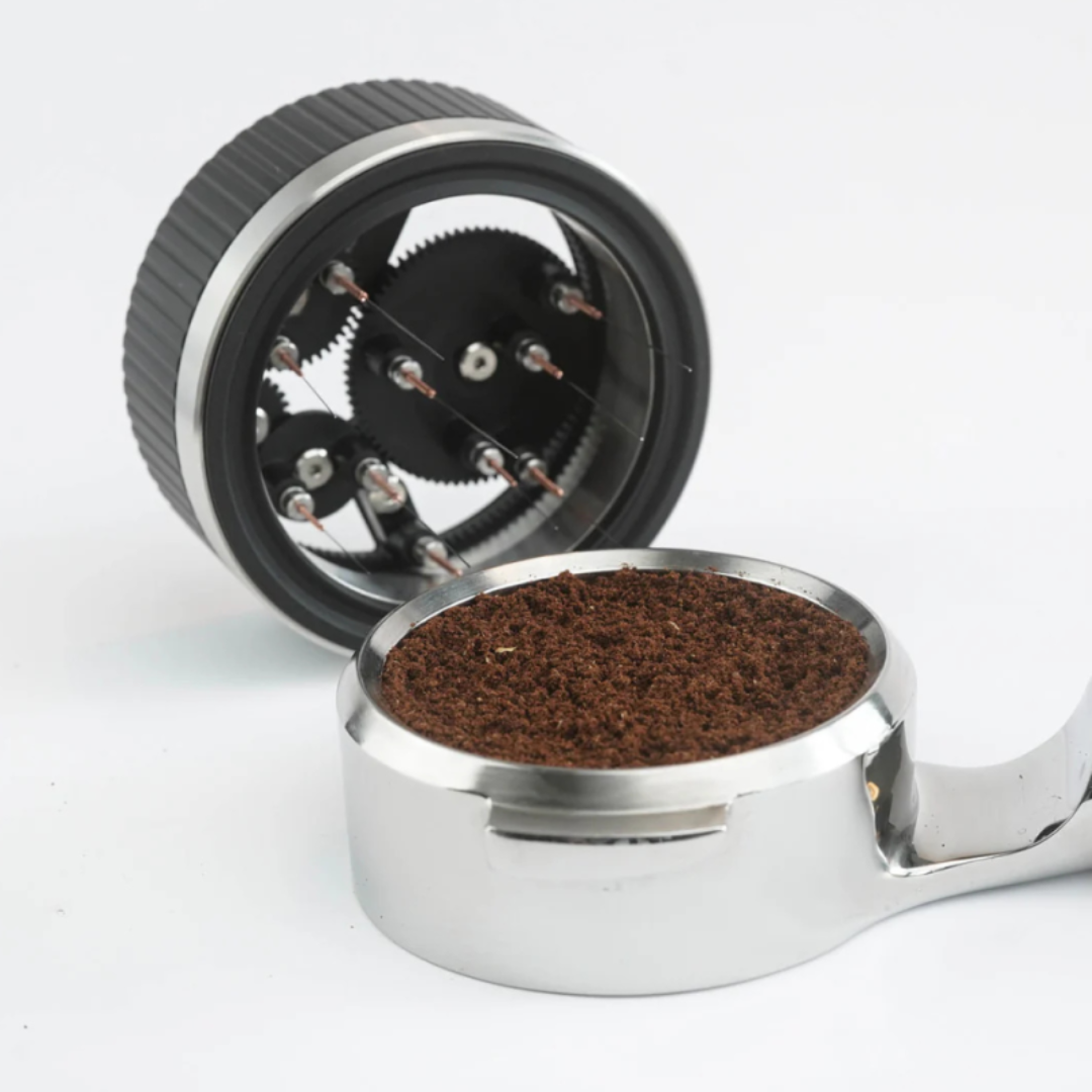 Designed for optimal compatibility with 58mm portafilters, it uses a unique mechanism to homogenize the coffee bed, setting it apart from other WDT tools.